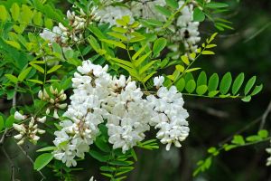 Le Robinia pseudoacacia ou Robinier faux-acacia est un arbre intéressant pour sa floraison de mai à juillet qui donne lieu à de jolies grappes pendantes de fleurs à l’odeur d’oranger. Son feuillage délicat et léger ainsi que son port ample, très aéré en font un arbre ornemental idéal pour créer un ombrage peu dense qui laisse les arbustes et vivaces pousser à son pied. Les fleurs blanches si typiques des papillonacées mesurent 2 cm tandis que les grappes mesurent de 10 à 20 cm de long. Les fleurs sont comestibles, on les déguste en beignets. Elles sont également très recherchées par les abeilles, ce qui donne un miel délicieux. Ce robinier doit aussi son succès à sa croissance rapide et sa grande facilité de culture en tout sol et sous presque tous nos climats, en dehors des régions trop ventées car son bois est cassant.