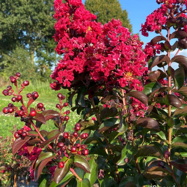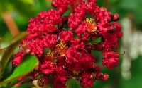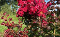 Voici un lilas des Indes à la couleur vibrante, que l'on imagine déchirant sans peine la lumière intense de l'été. Cet adorable arbuste caduc et résistant séduit par son port compact, son feuillage sombre, ses jeunes pousses rouges, son écorce décorative, mais aussi et surtout pour son époustouflante floraison estivale rouge cerise. Avide de soleil et de chaleur, il est incontestablement l'un des plus beaux arbustes à floraison estivale. Il mérite une place de choix dans le jardin. Installé dans un grand pot sur la terrasse, il vous vaudra les compliments de tous.