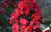 Lagerstroemia indica 'Dynamite' appartient à la famille des Lythraceae. Lagerstroemia indica, dont il est issu, est originaire de Chine. Cet arbuste présente un port buissonnant et ramifié, étalé à couronne arrondie. Il atteindra 4 m de hauteur à mâturité, pour un diamètre de 3 m. Sa croissance est assez rapide. Il choisit le mois de juillet pour amorcer sa floraison, qui se poursuivra jusqu'en octobre. Les fleurs se caractérisent par de fins pédicelles portant chacun cinq pétales à bord ondulé qui composent cette fleur. Les fleurs, dont la texture rappelle celle du crêpe sont rassemblées en grandes panicules bien denses, à l'extrémité des branches de l'année. Chez 'Dynamite', les boutons sont cramoisis, puis ils s'épanouissent en rouge cerise intense. Le feuillage, coriace et caduc, nait rouge, puis devient vert foncé et luisant. Il est composé de petites feuilles ovales, qui prennent parfois de jolies teintes jaunes ou rouge à l'automne, en fonction du climat. Enfin, et pour terminer en beauté, son écorce est de toute beauté, lisse, beige striée de brun-rouge, se desquamant en plaques colorées (canelle, rouge éteint, vieux rose, crème).